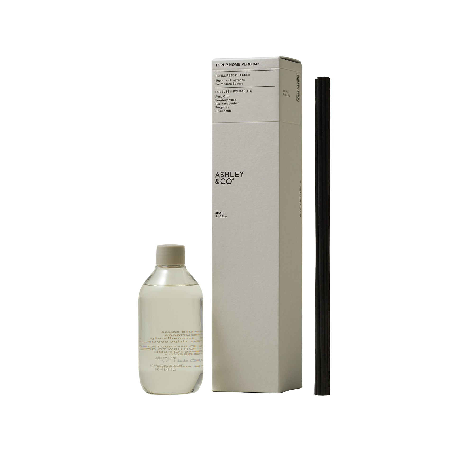 - Never let your scent run dry! Keep your home smelling just so by stocking up on this convenient, efficient Topup kit. Designed to refill your Ashley & Co. hand blown Home Perfume glass vase, each Topup includes 250ml of your chosen Ashley & Co. signature scent, plus a fresh supply of reed sticks.