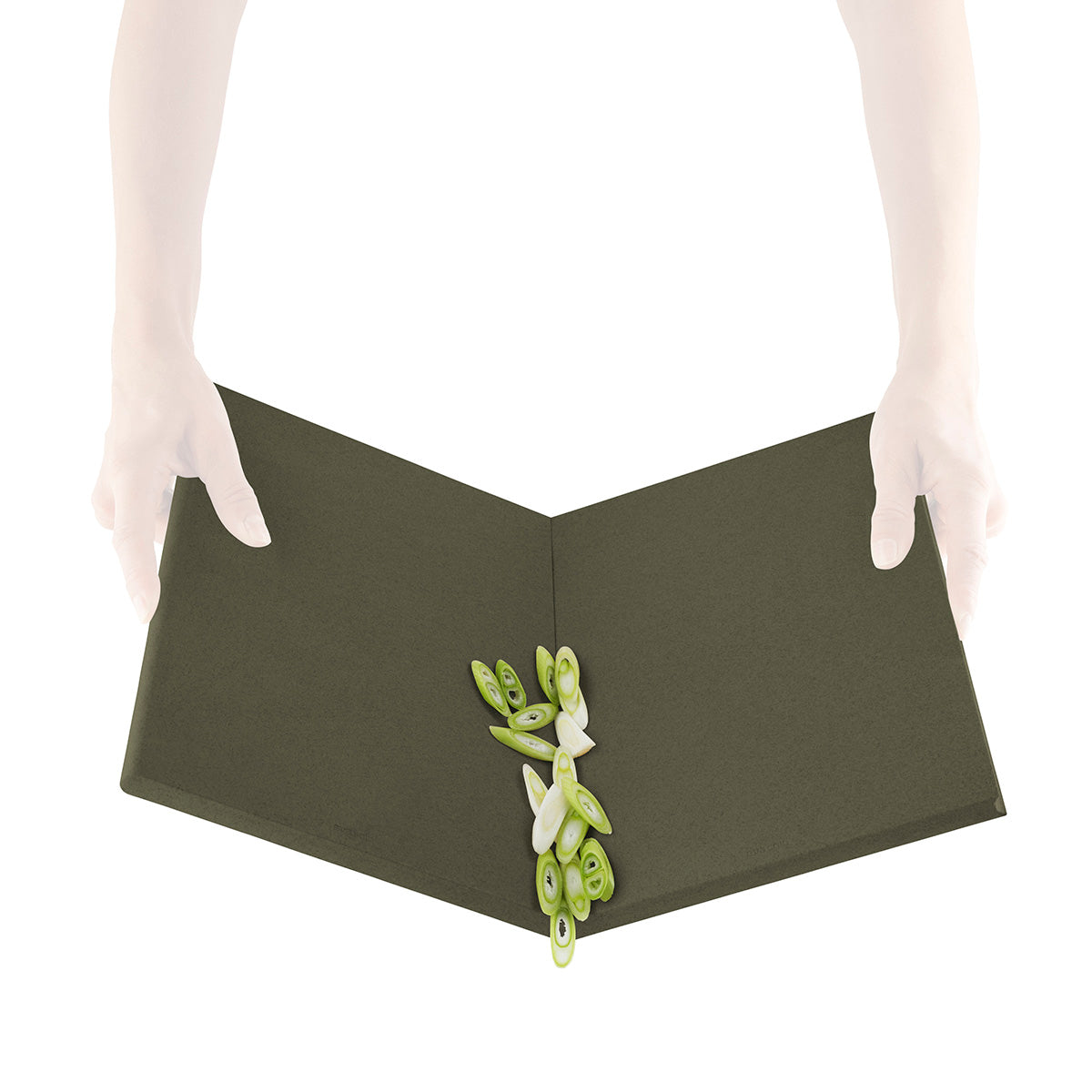 Place the two cutting boards up against each other, then fold in the middle for an easy way to transport ingredients from bench to stove top. Store the cutting boards flat or placed on top of each other, depending on the available space in your kitchen.