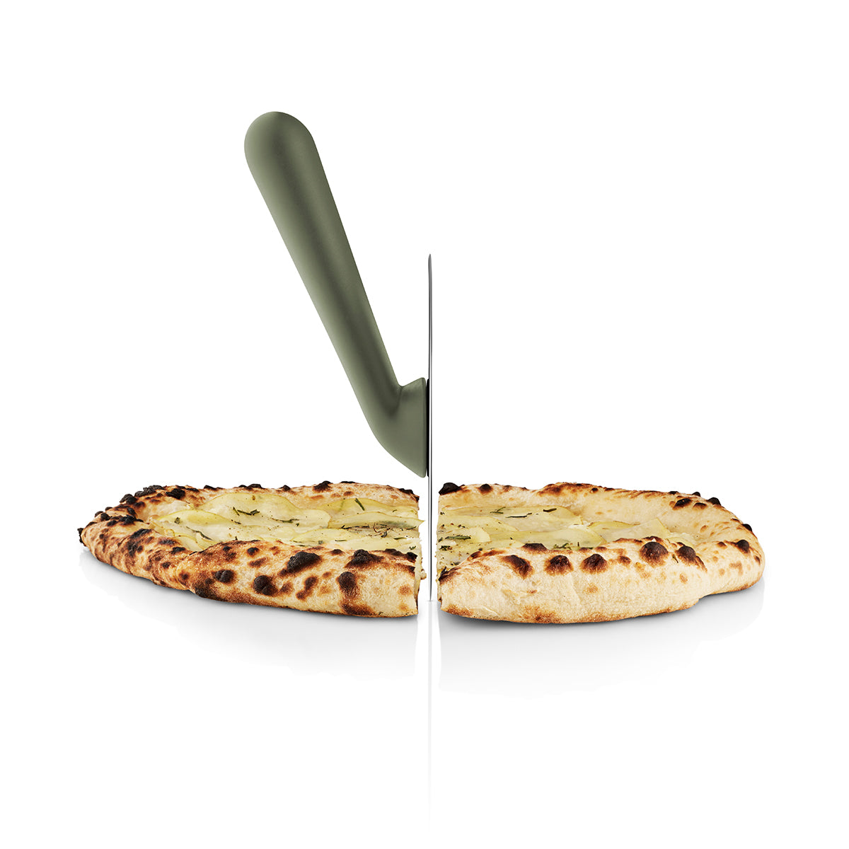 - With its large wheel, sharp blade and solid weight, it easily slices through both thin crispy bases and thick deep pan pizzas.