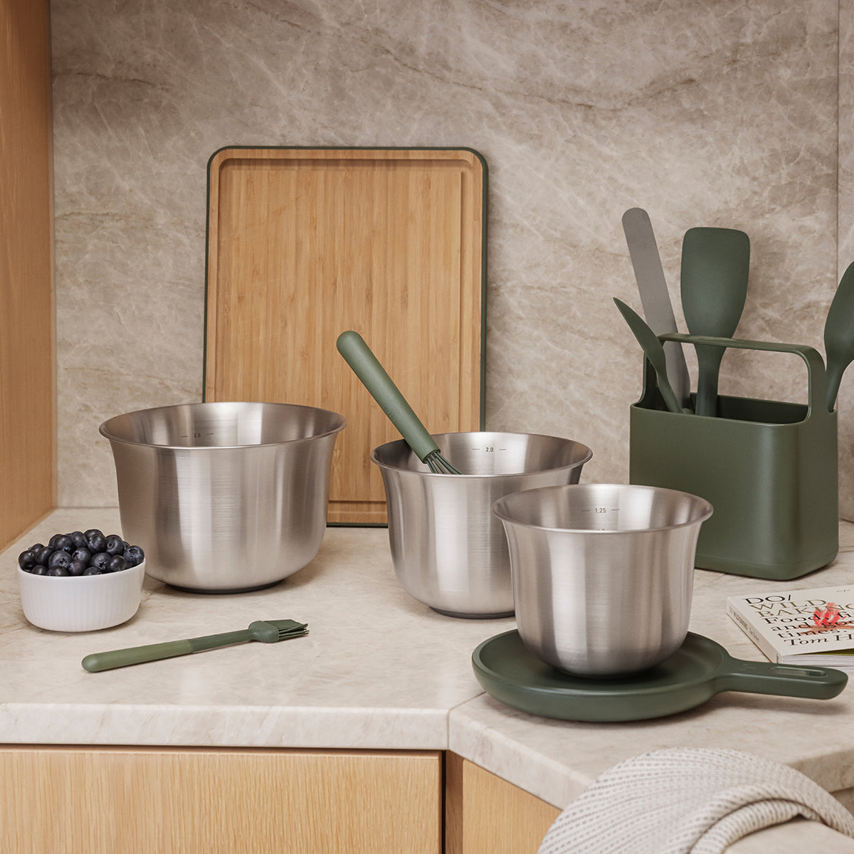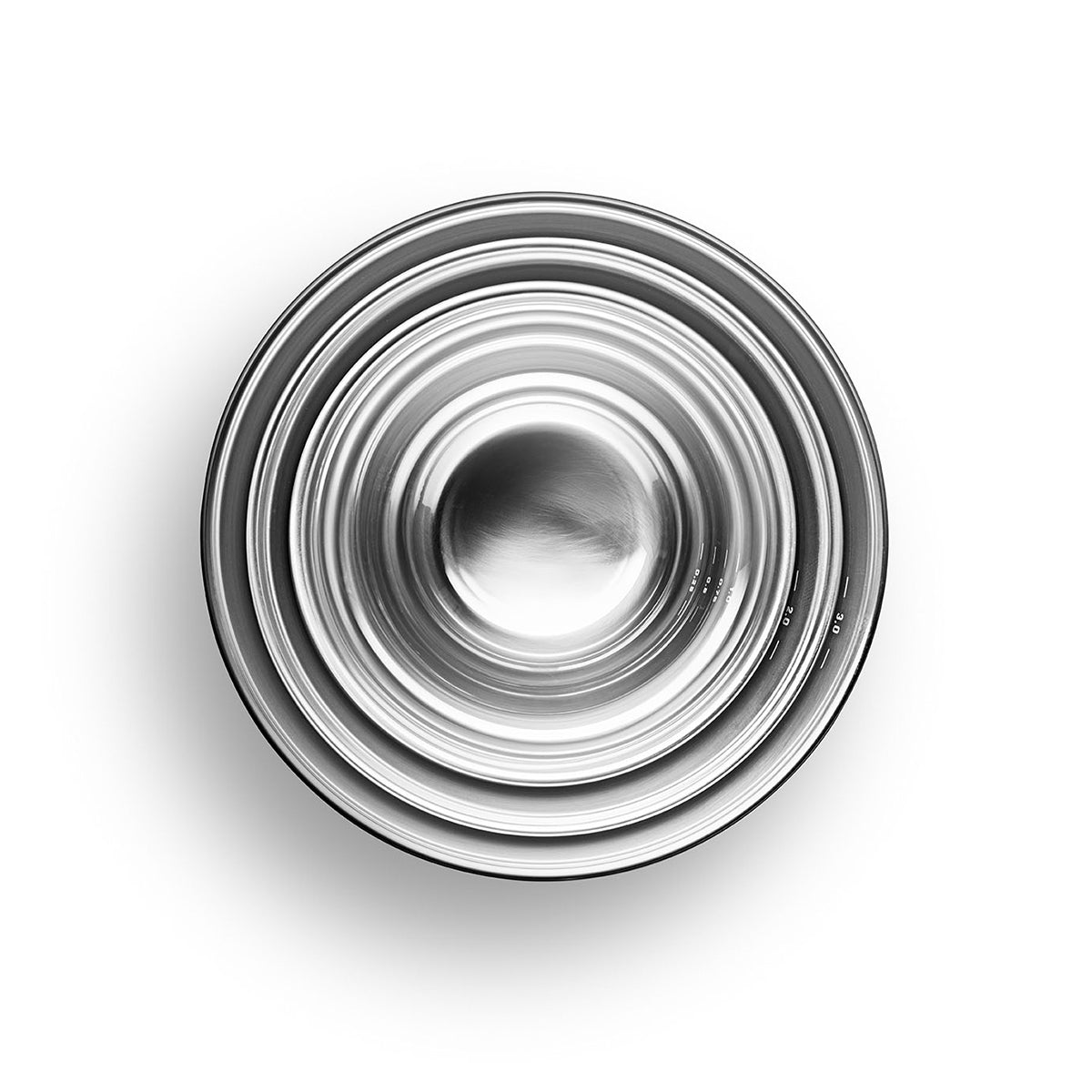 The bowls are made of 90% recycled post-consumer stainless steel, which makes them durable and resistant to knocks, bumps and scratches, while a rubber ring in the base stabilises the bowls on your kitchen countertop.