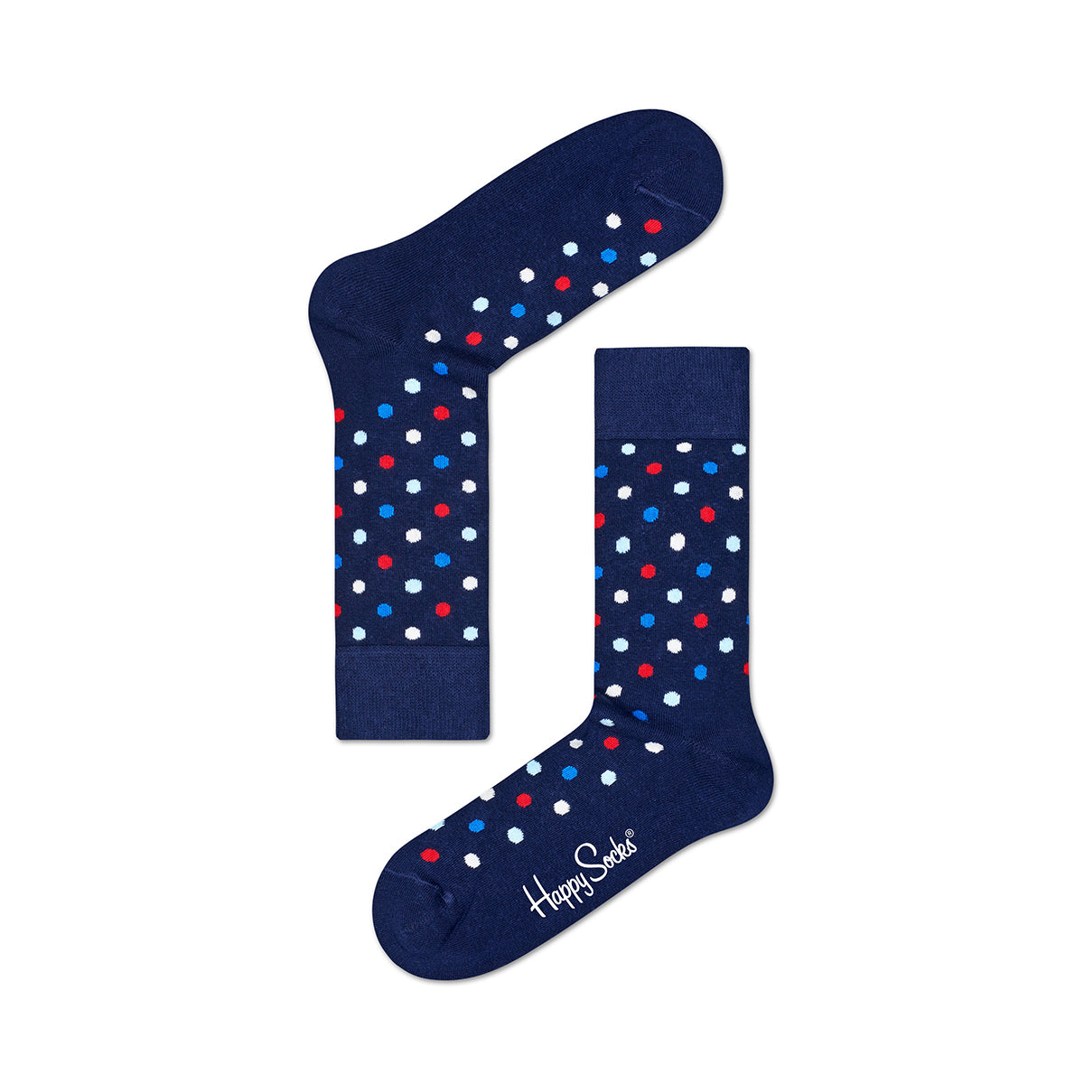 Update your sock drawer with our classic Dot sock. A soft, navy background is sprinkled with small dots in a muted lighttte of white, cobalt blue and red. Made from combed cotton for added comfort, this tasteful pair of socks is completed with a navy blue heel, toe, sole and cuff.