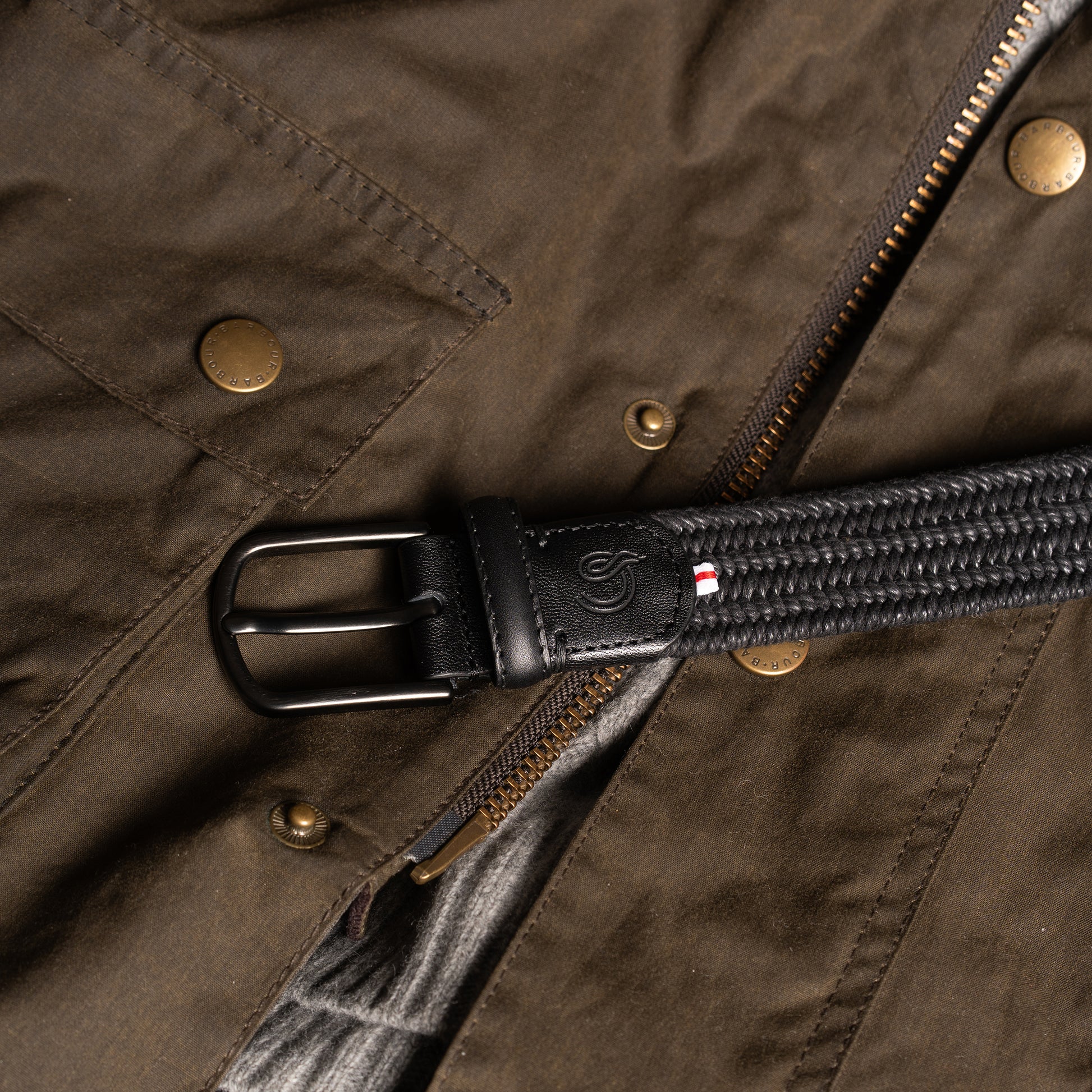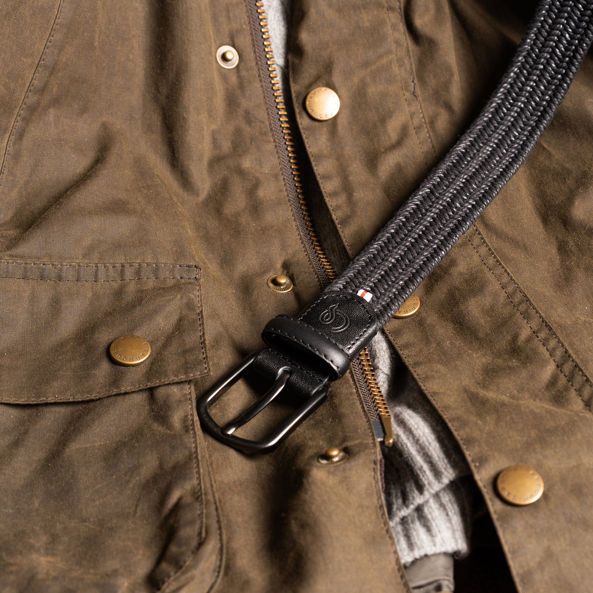 Premium braided belt with waxed cotton texture. Black buckle.