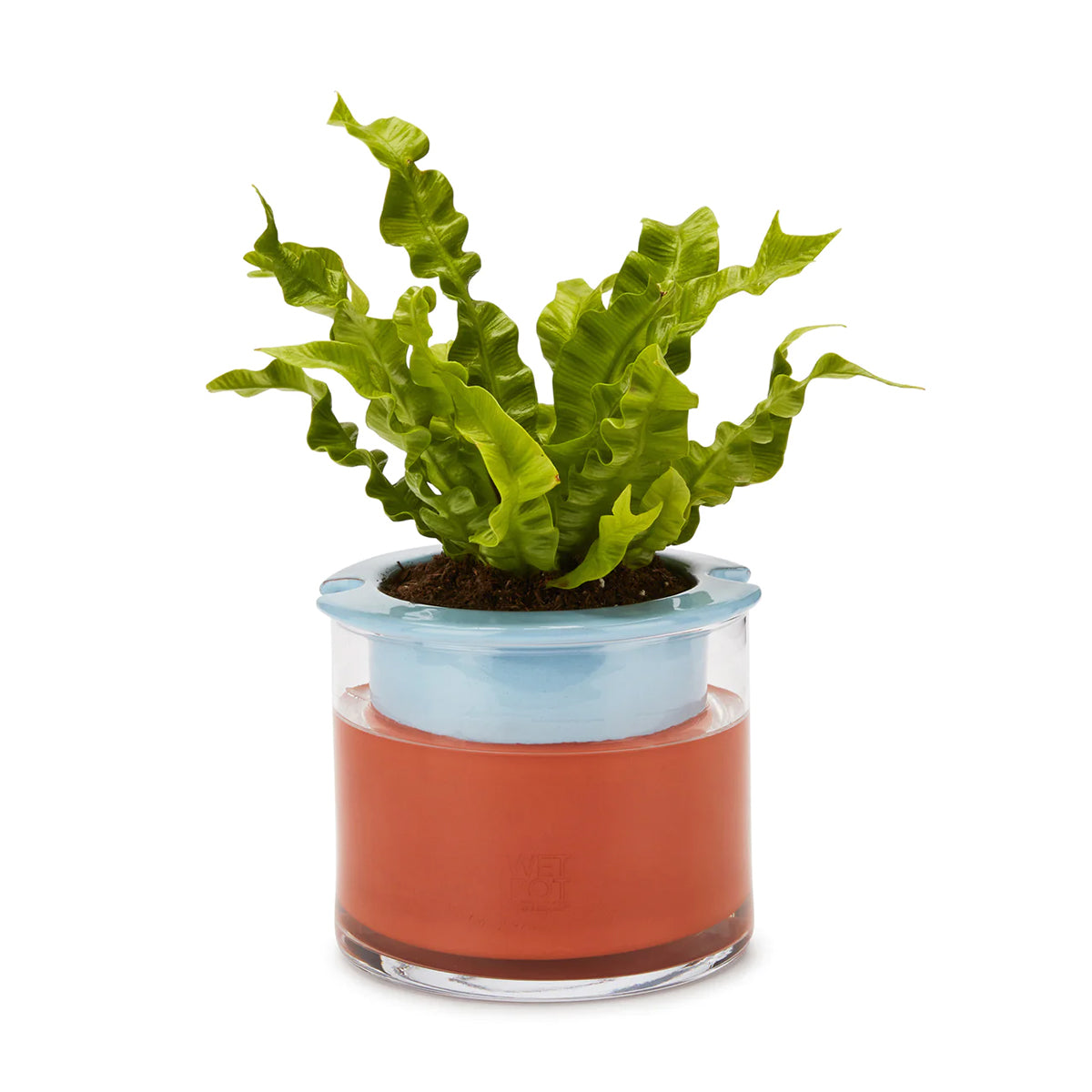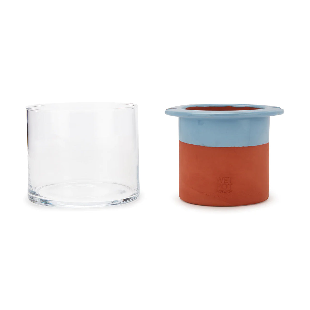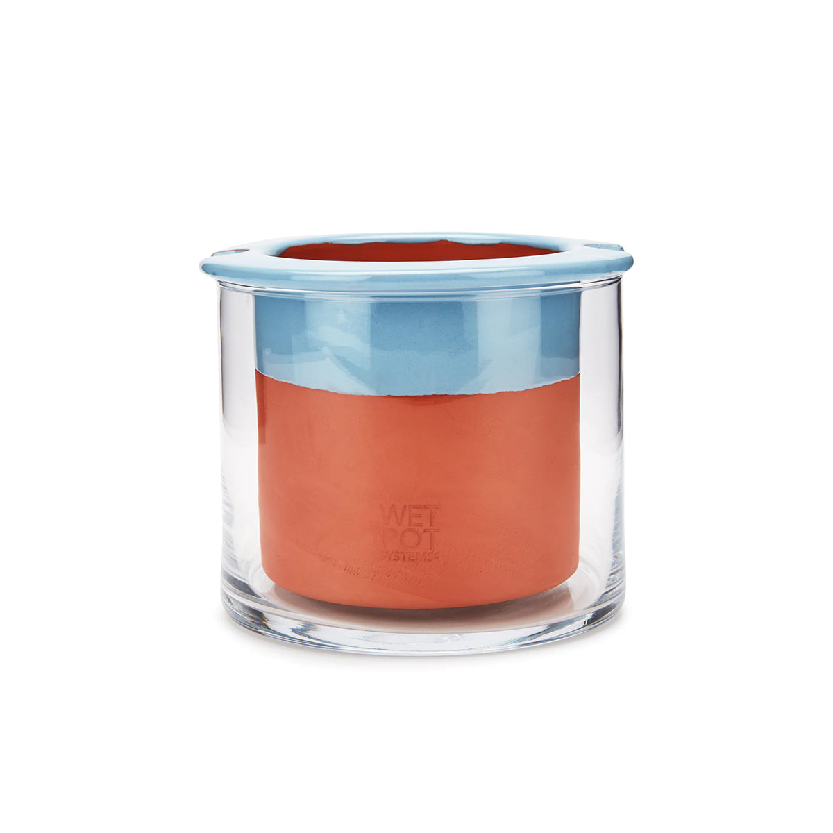 Self-watering plant pot. Terracotta and hand-blown glass. Light blue accent.