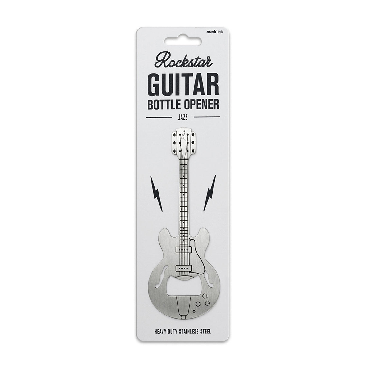 Stainless steel bottle opener in the shape of a jazz guitar.