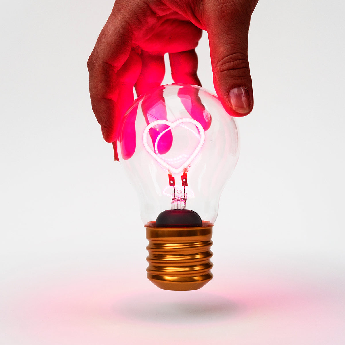 An homage to the humble Edison light bulb recreates the classic look with a warm pink heart. Timeless and beautiful with a sexy twist.