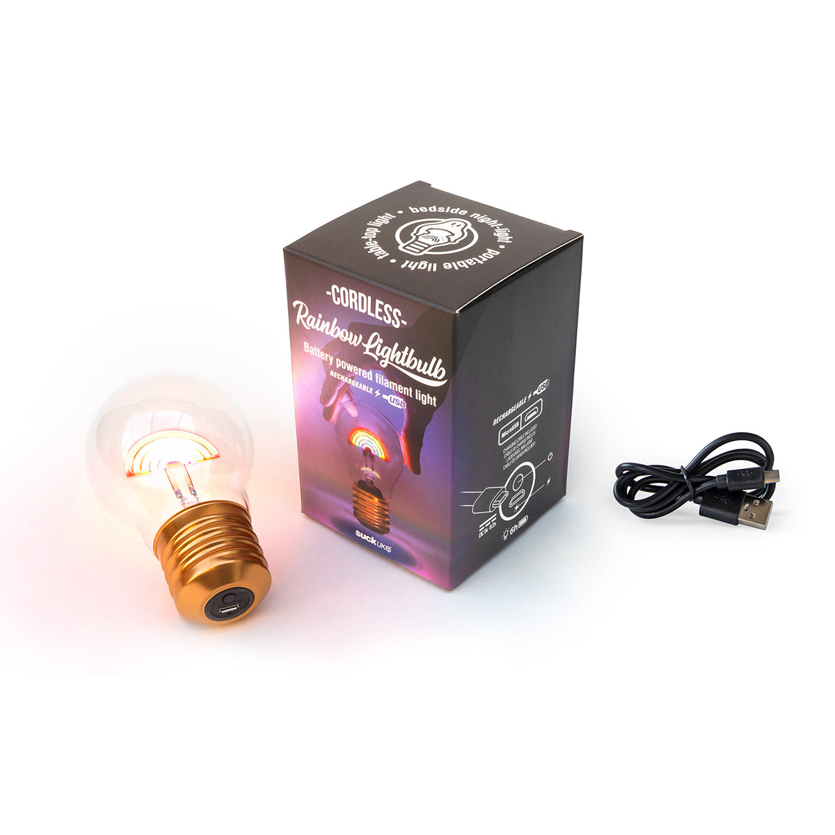 Standalone lightbulb with rechargeable battery and cheerful rainbow detail.