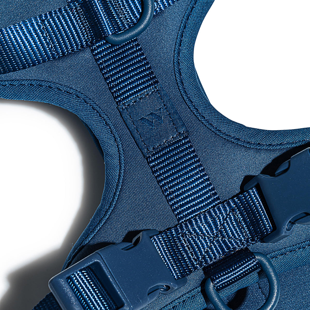 Materials: soft stretch poly base, woven nylon straps, coated carbon steel D-rings.